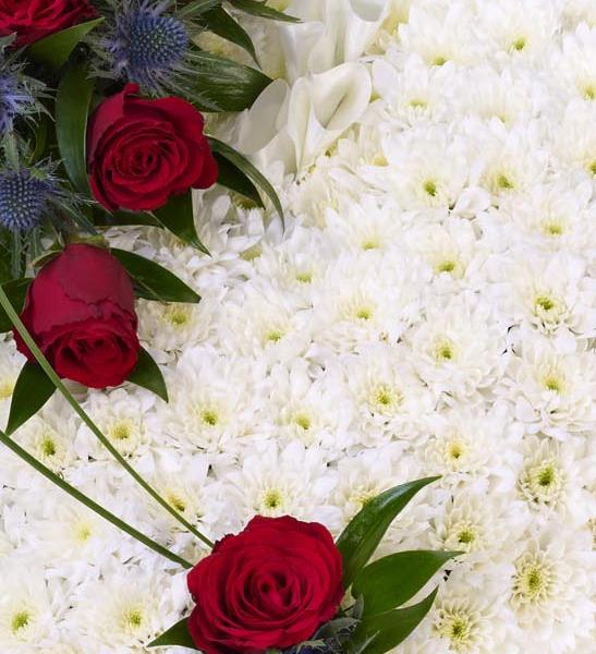 A classic heart-shaped design covered with a mass of white double spray chysanthemums and finished with a spray of red large-headed roses, eryngium and ruscus.